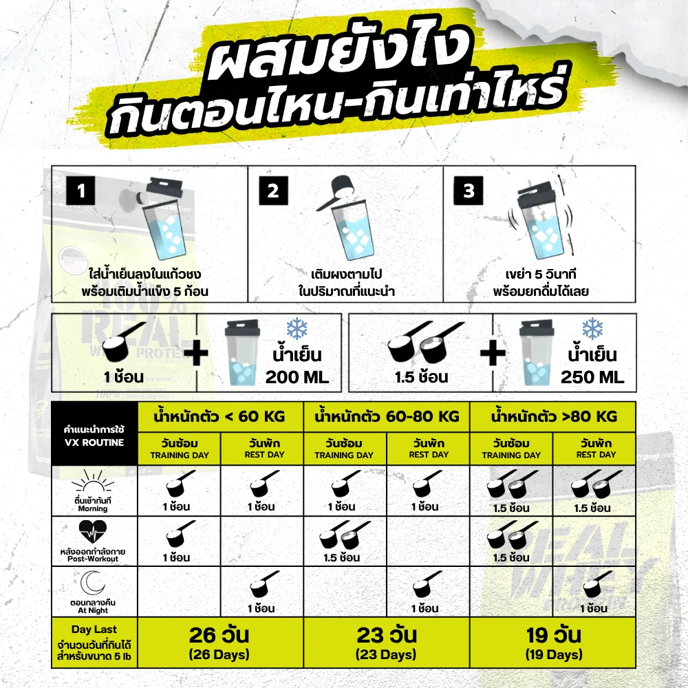 ใช้เวย์โปรตีนที่นำเข้าจาก USA เป็นวัตถุดิบหลักของส่วนผสม