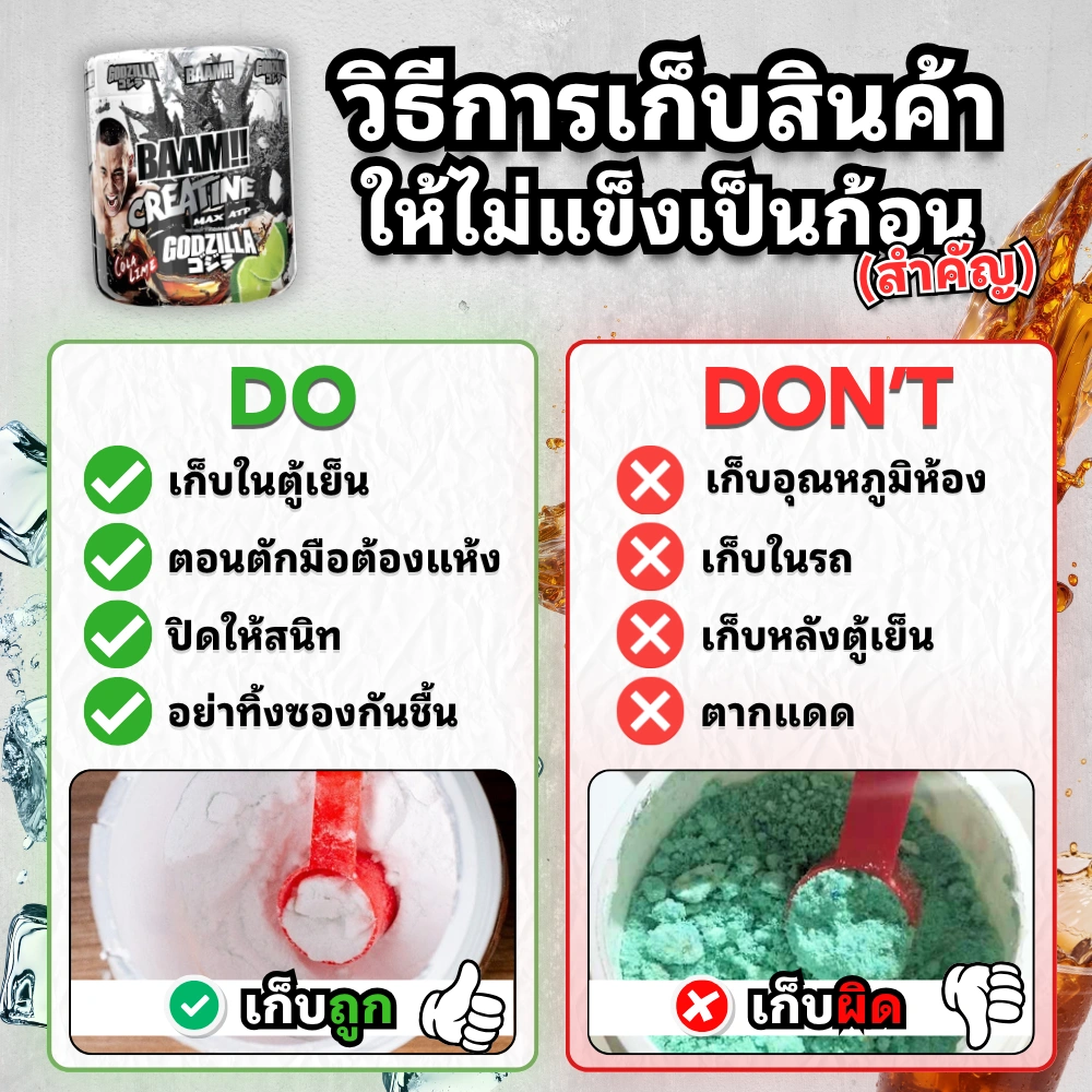 • Creatine อาจจับตัวเป็นก่อน (ตามธรรมชาติ) สามารถใช้ช้อบดเพื่อให้กลับมาเป็นผง และทานได้ตามปกติ