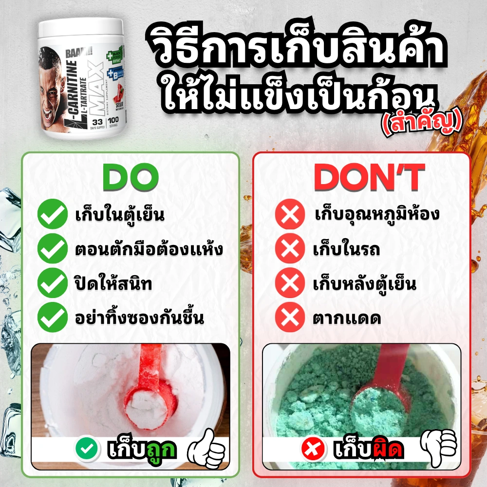 ผสม BAAM L-Carnitine MAX 1/3 ช้อน ใส่น้ำเย็น 100 ml และน้ำแข็ง 2 ก้อน