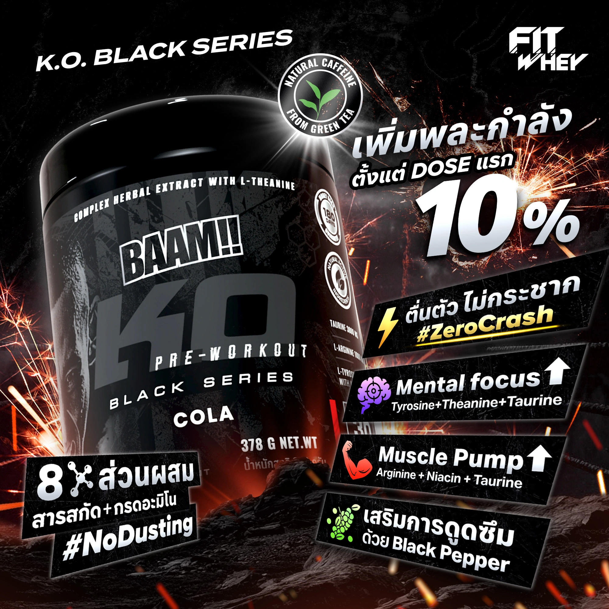ส่วนผสมสร้างแชมป์สังเวียน K.O. Black Series สารสกัดชาเขียว (Green Tea Extract) ช่วยให้ตื่นตัวด้วยคาเฟอีนจากธรรมชาติ ช่วยให้รู้สึกรีเฟรชสดชื่น อย่างต่อเนื่อง และยังมี ECGC (Epigallocatechin gallate) สารต้านอนุมูลอิสระจากธรรมชาติ สารสกัดพรมมิ (Brahmi Extract) บรามิสมุนไพร ที่ช่วยในเรื่องของสมองเป็นอย่างดี มีส่วนช่วยให้ Mind-Muscle Connection ทำงานได้ดีขึ้น คุมพลังได้ไม่หลุดโฟกัส สารสกัดพรกไทยดำ (Black Pepper Extract) เสริมการดูดซึมของสารสกัด อะมิโน และวิตามินต่างๆ ให้ที่คุณกินเข้าไปได้รับแบบเต็มที่ ทอรีน (Taurine) ช่วยในการหดตัวของกล้ามเนื้อและระบบประสาท (Mind-muscle connection) ลดความล้าระหว่างซ้อม เสริมความพร้อมและความกระตือรือร้นในการออกกำลังกาย แอล-อาจินีน (L-Arginine) มีบทบาทโดยตรงในการผลิต ไนตริกออกไซด์ (NO)ช่วยในการไหลเวียนของเลือด เพิ่มความต่อเนื่องระหว่างเซท ลุยได้ต่อเนื่อง แอล-ไทโรซีน (L-Tyrosine) ช่วยเพิ่มความเฉียบคม สมองไม่ฟุ้งระหว่างเทรน ให้มีสมาธิ ไม่ว่อกแว่ก แอล-ทีอะนีน (L-Theanine) สามทหารเสือ ร่วมกับ Green Tea Extract และ Tyrosine ให้เร่งแรงได้แต่ไม่ฟุ้ง วิตามิน บี 3 (B3 ; Niacin) มีบทบาทสำคัญในการเปลี่ยนพลังงานระดับเซลล์ ลดโอกาสเกิดความอ่อนล้าระหว่างเซต